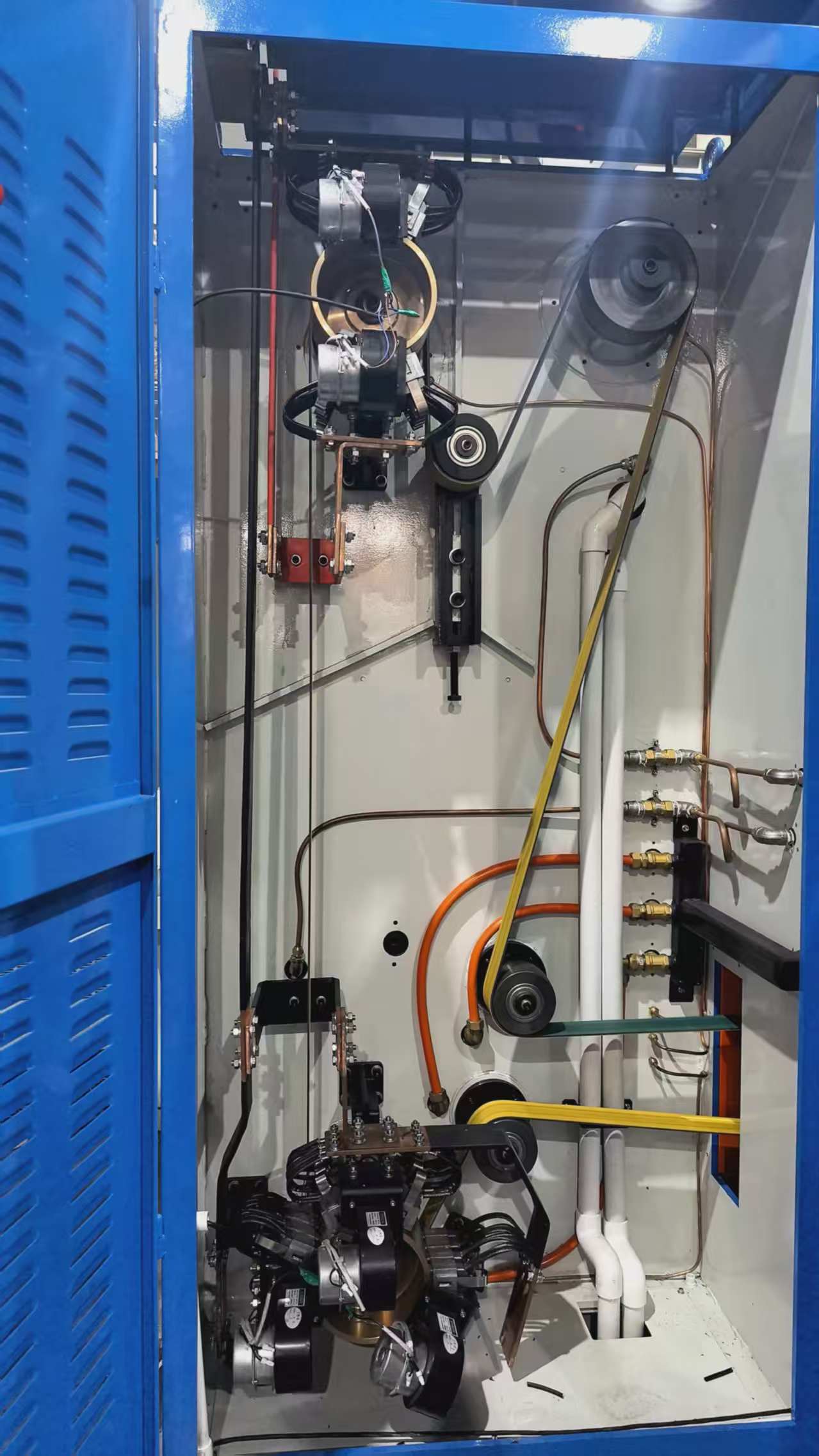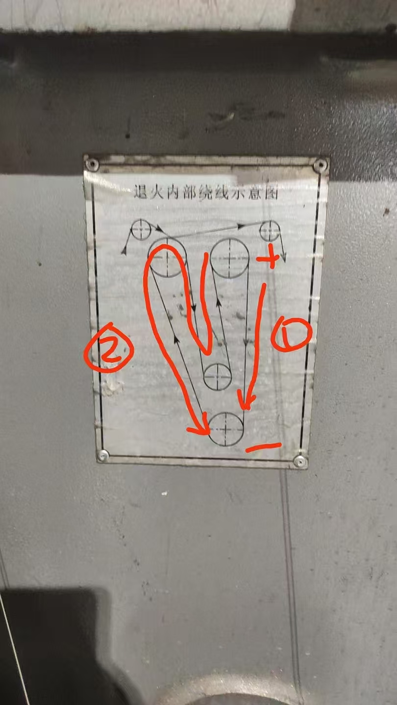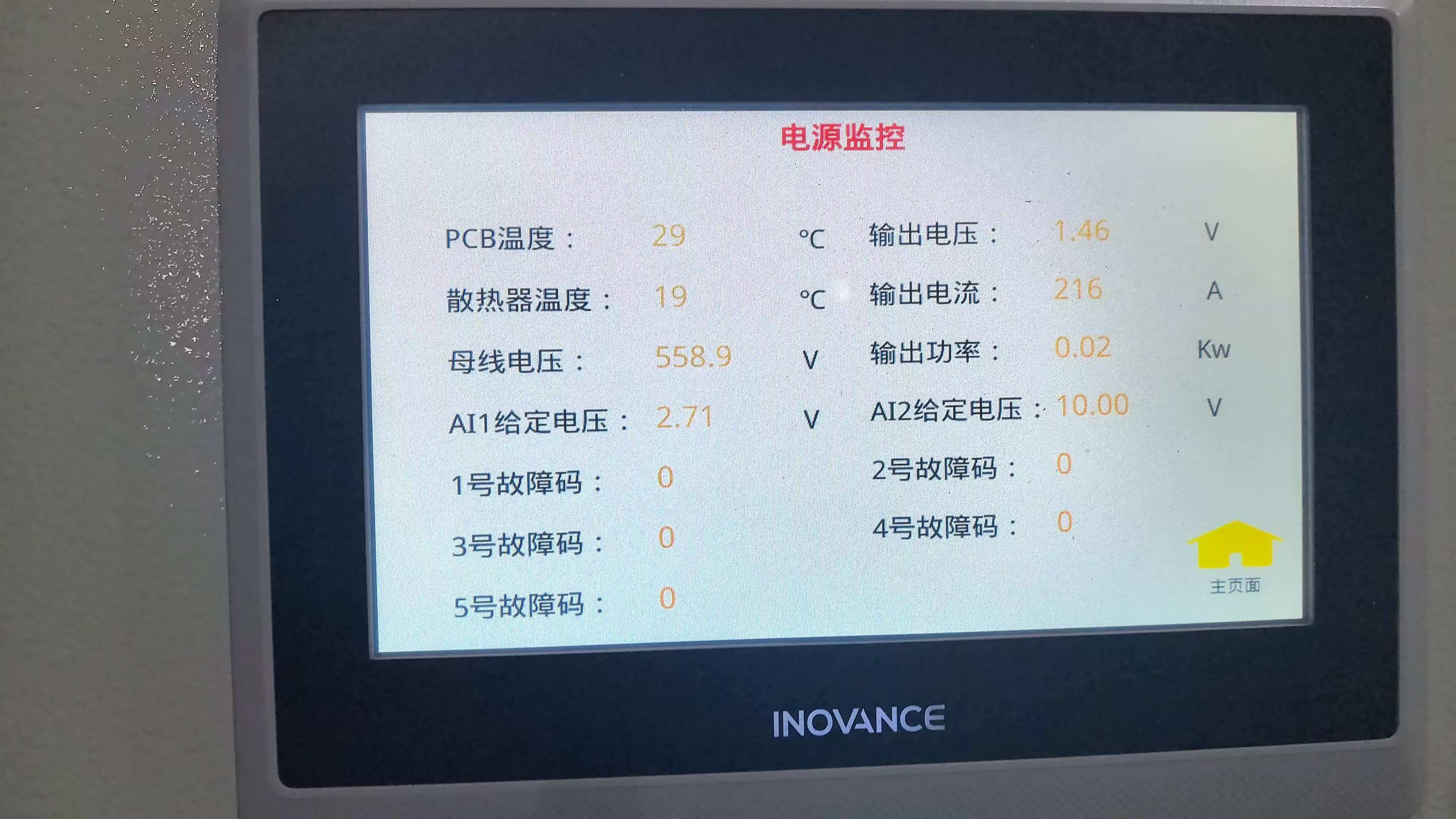 自动换盘,1小时一换,换盘时设备不停不减速,输出功率与生产时一样,日常最大收线速度1100、退火40%,输出电压52V左右浮动,三台模块总电流570A左右、一台模块电流190A左右